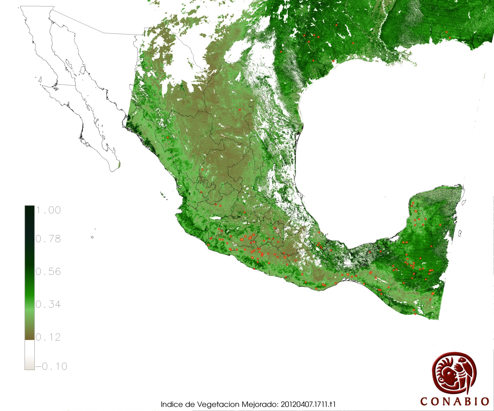 Los valores del índice van de -1 a 1, entre más cercano al valor 1 la vegetación presenta mayor vigor. Los índices de vegetación son utilizados para conocer el comportamiento de la vegetación tanto espacial como temporal. |