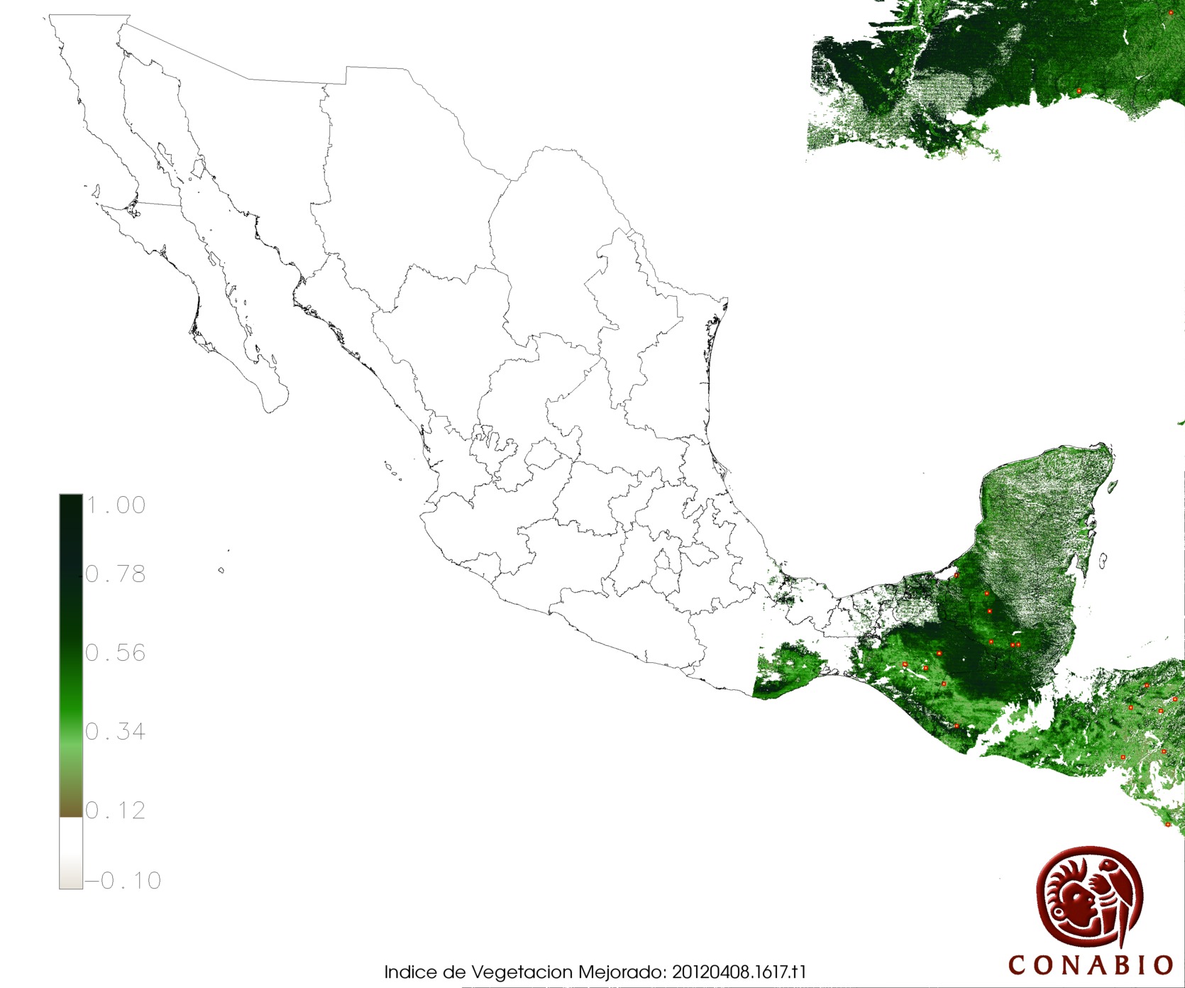 Los valores del índice van de -1 a 1, entre más cercano al valor 1 la vegetación presenta mayor vigor. Los índices de vegetación son utilizados para conocer el comportamiento de la vegetación tanto espacial como temporal. |