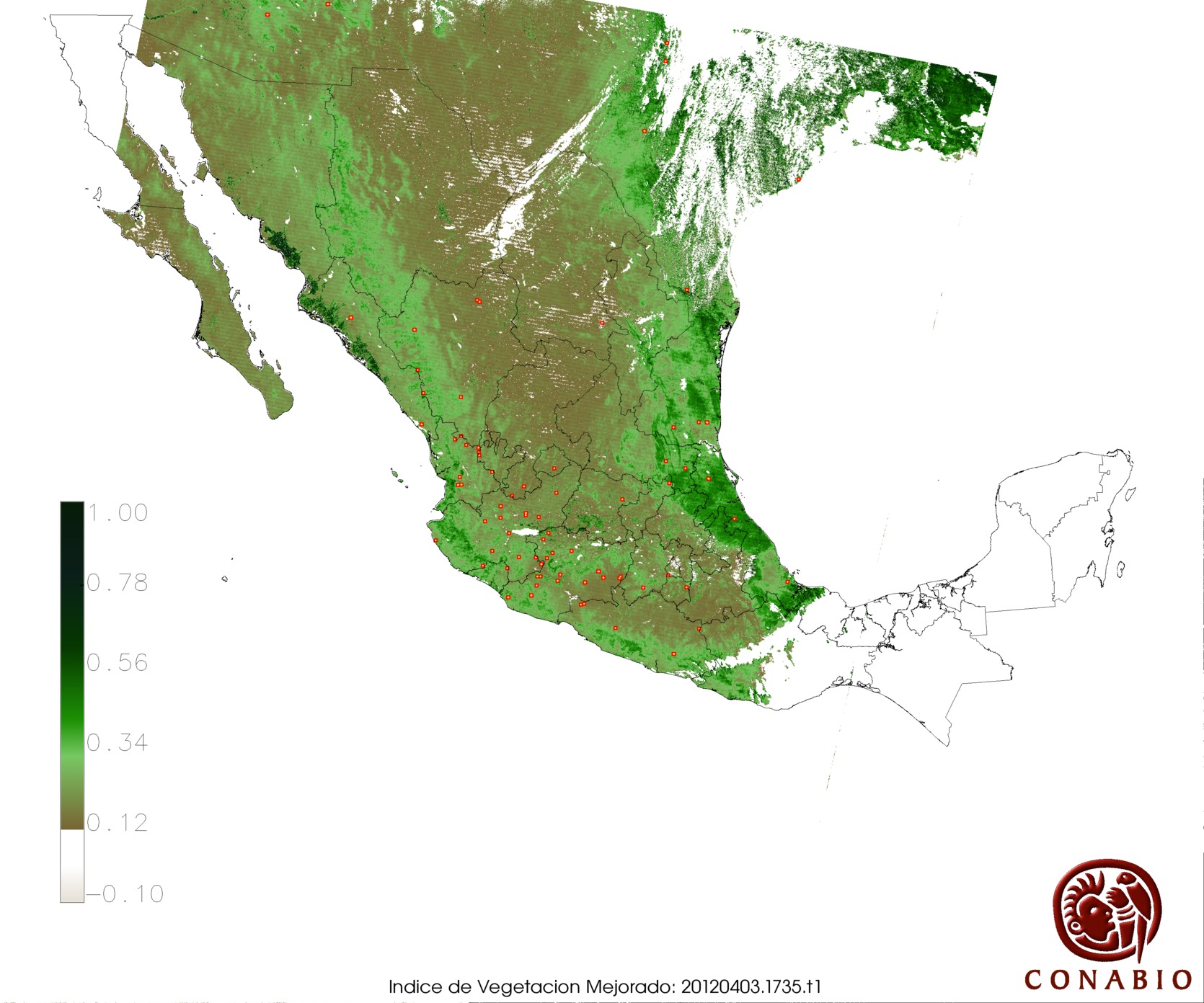 Los valores del índice van de -1 a 1, entre más cercano al valor 1 la vegetación presenta mayor vigor. Los índices de vegetación son utilizados para conocer el comportamiento de la vegetación tanto espacial como temporal. |