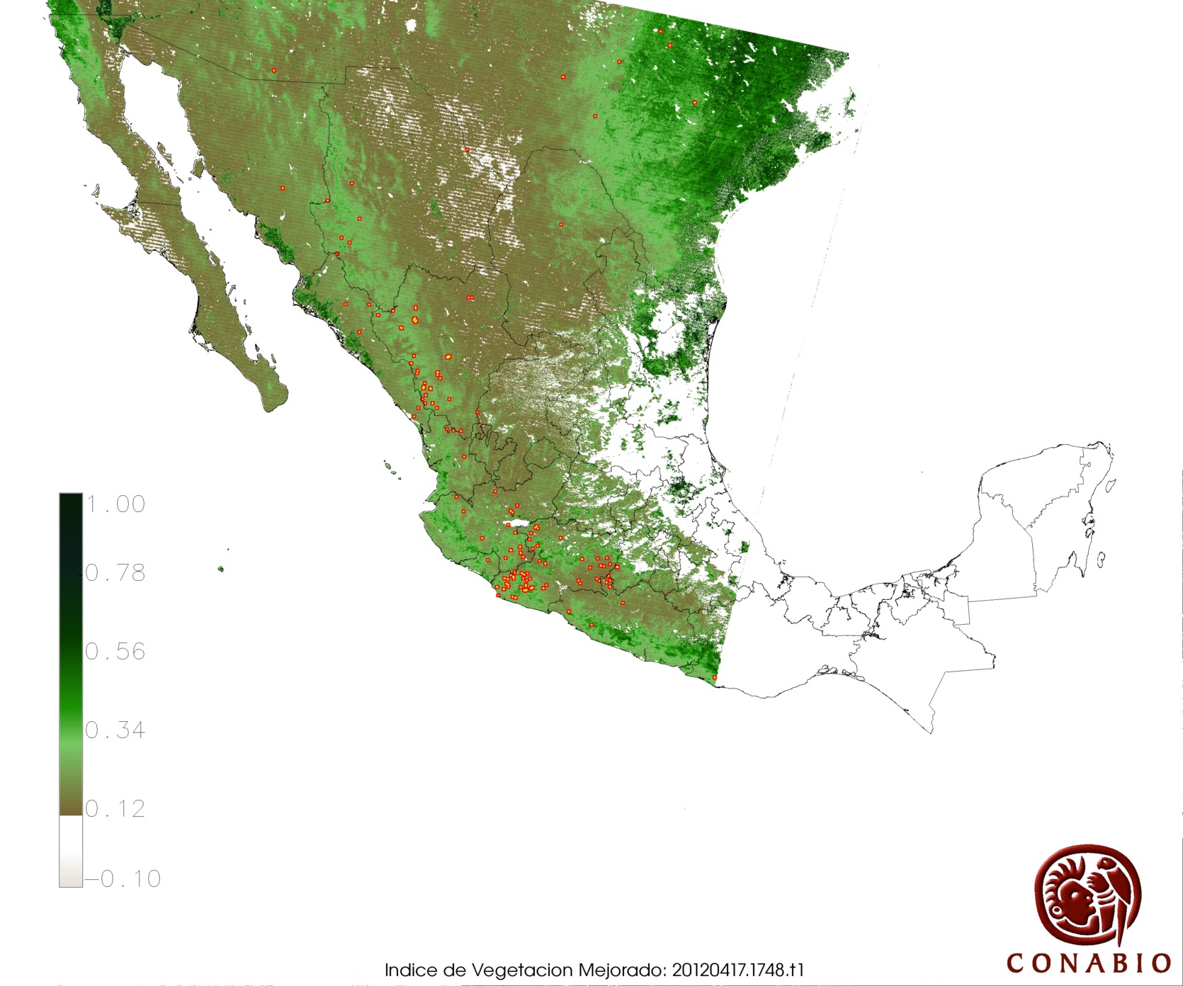 Indica el riesgo de propagación de incendios forestales. Se basa exclusivamente en el vigor de la vegetación, cuanto más seca está la vegetación, más rápido se podrá extender el posible fuego (incendio). Los valores para el índice son: Bajo -> Normal -> Alto -> Muy alto NA (No aplica) se refiere al agua, vegetación no arbolada y los usos de suelo mostrados en gris. ND (No disponible) indica que no hubo información para generar el índice. |