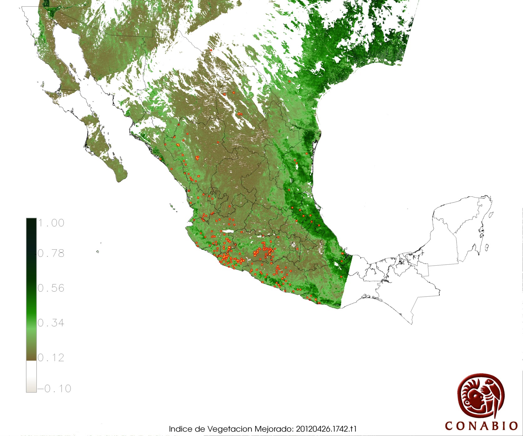 Nubosidad en el terreno:19% Nubosidad sobre México:12% Datos nulos en la escena:0% Datos nulos sobre México:0% |
