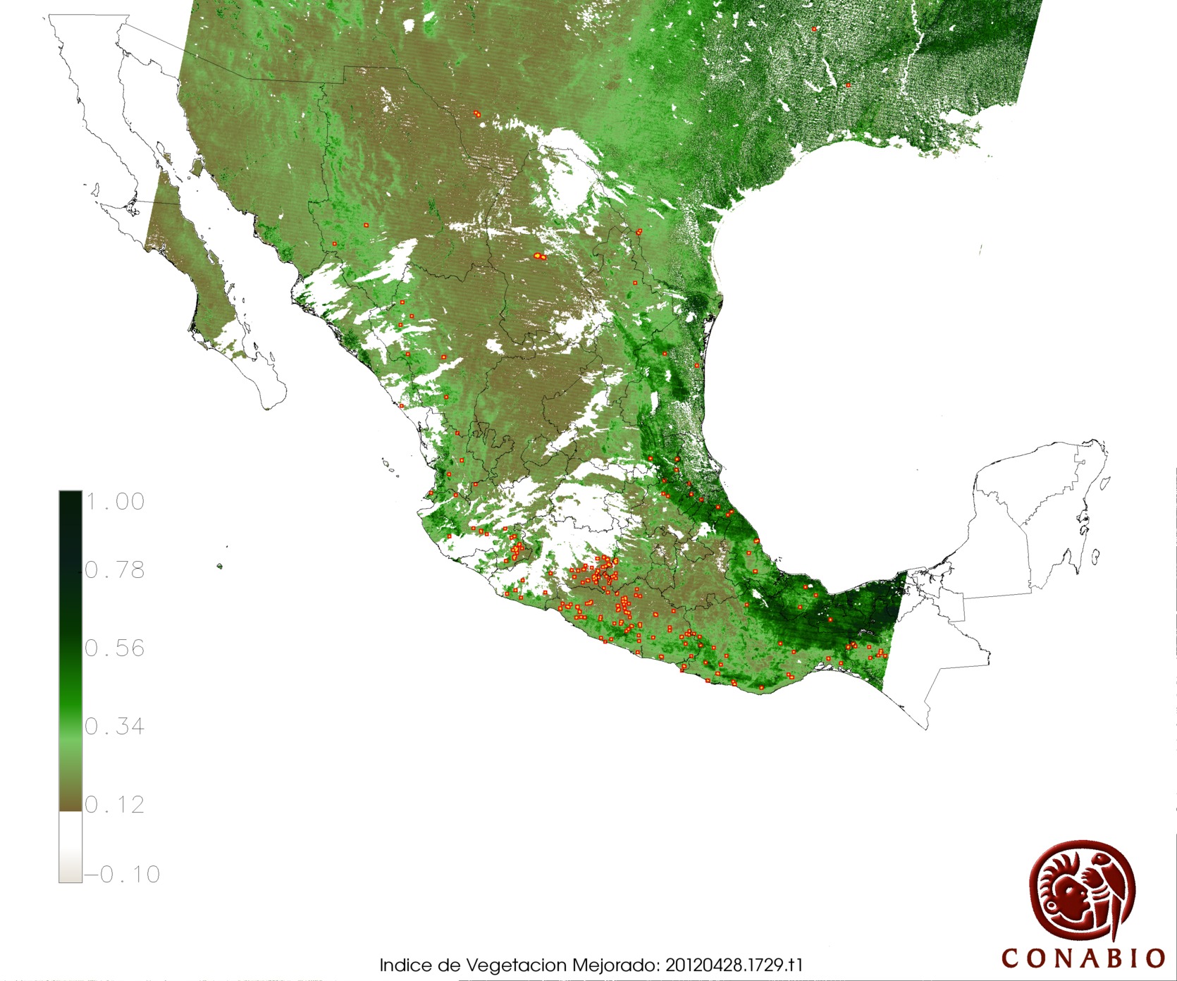 Los valores del índice van de -1 a 1, entre más cercano al valor 1 la vegetación presenta mayor vigor. Los índices de vegetación son utilizados para conocer el comportamiento de la vegetación tanto espacial como temporal. |