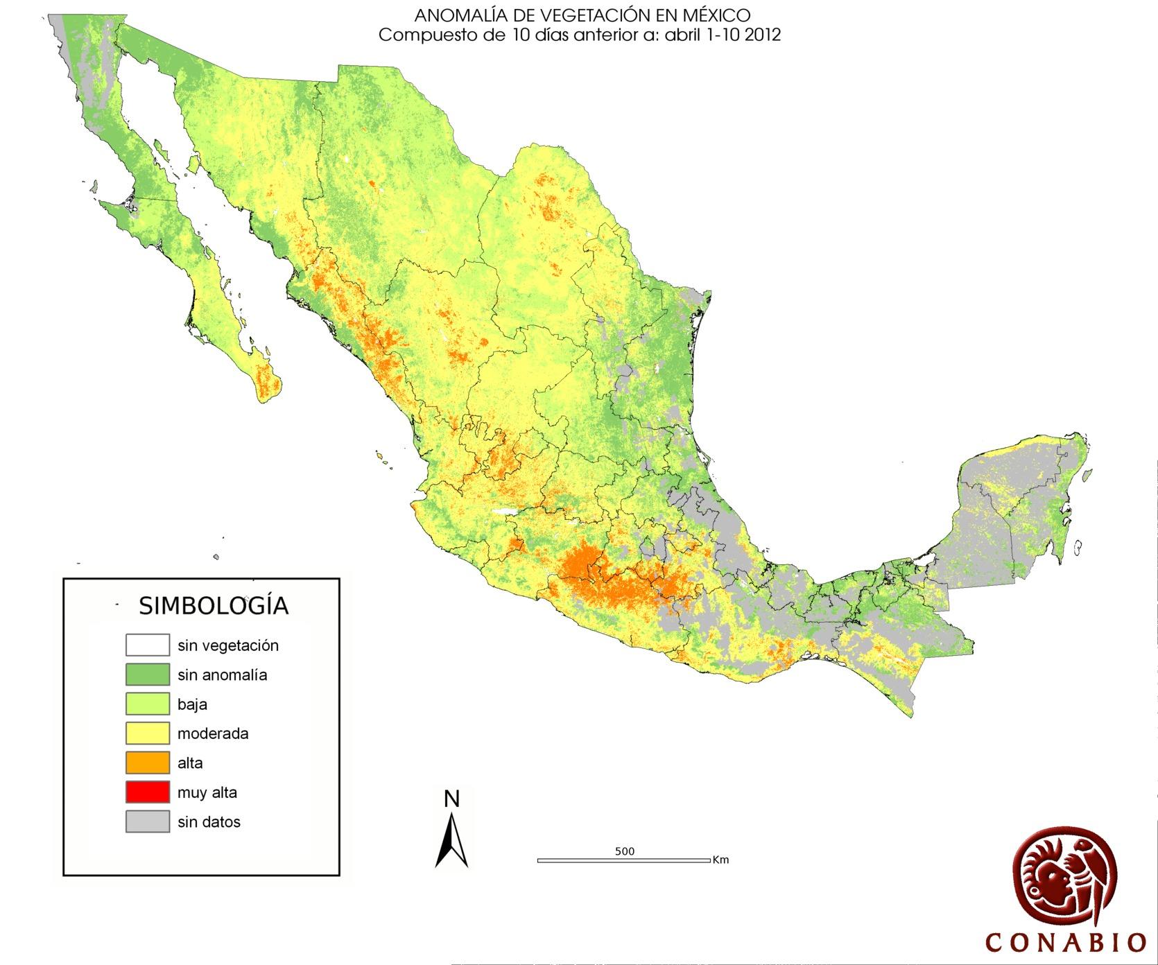 Indica el riesgo de propagación de incendios forestales. Se basa exclusivamente en el vigor de la vegetación, cuanto más seca está la vegetación, más rápido se podrá extender el posible fuego (incendio). Los valores para el índice son: Bajo -> Normal -> Alto -> Muy alto NA (No aplica) se refiere al agua, vegetación no arbolada y los usos de suelo mostrados en gris. ND (No disponible) indica que no hubo información para generar el índice. |