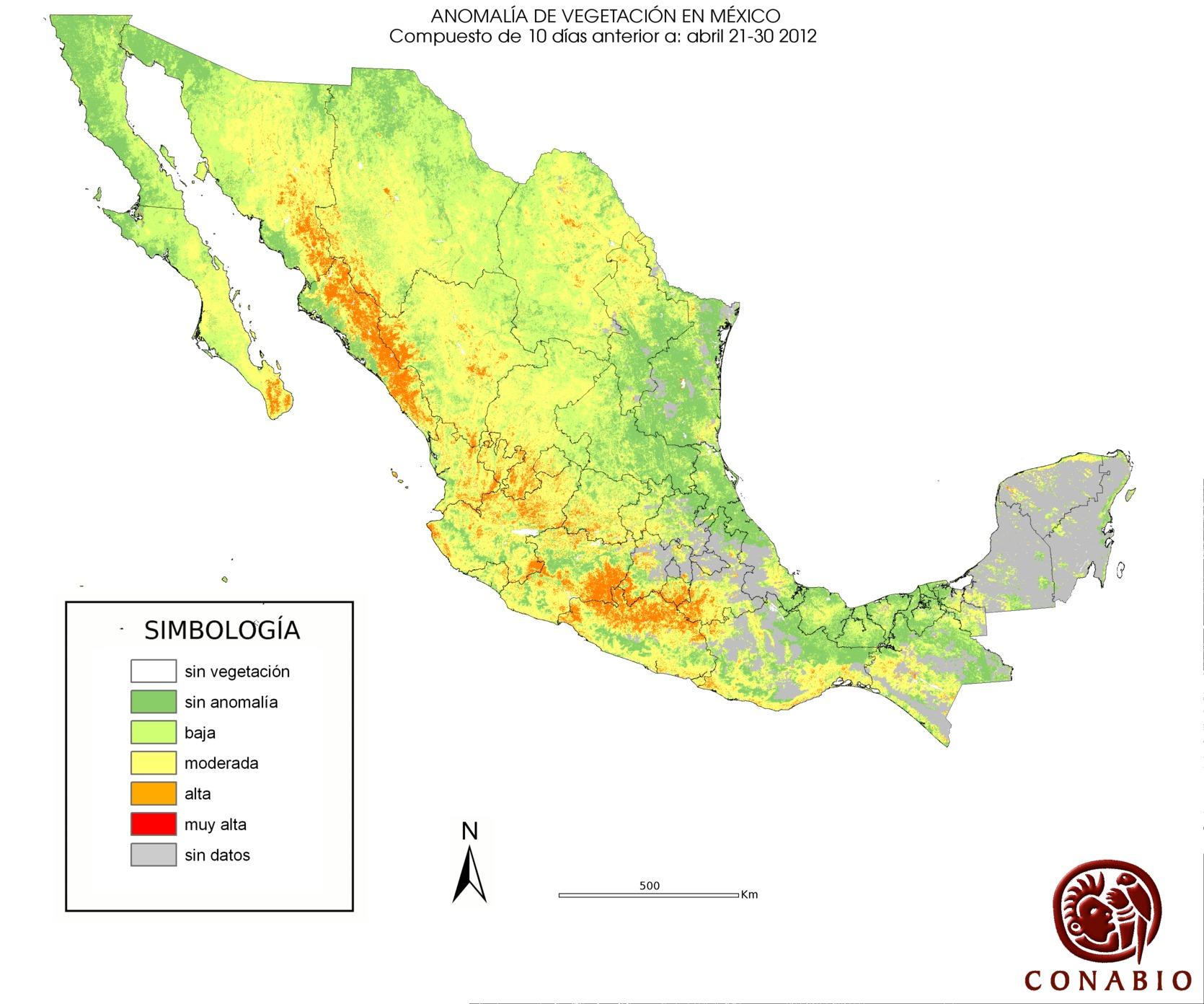 Indica el riesgo de propagación de incendios forestales. Se basa exclusivamente en el vigor de la vegetación, cuanto más seca está la vegetación, más rápido se podrá extender el posible fuego (incendio). Los valores para el índice son: Bajo -> Normal -> Alto -> Muy alto NA (No aplica) se refiere al agua, vegetación no arbolada y los usos de suelo mostrados en gris. ND (No disponible) indica que no hubo información para generar el índice. |
