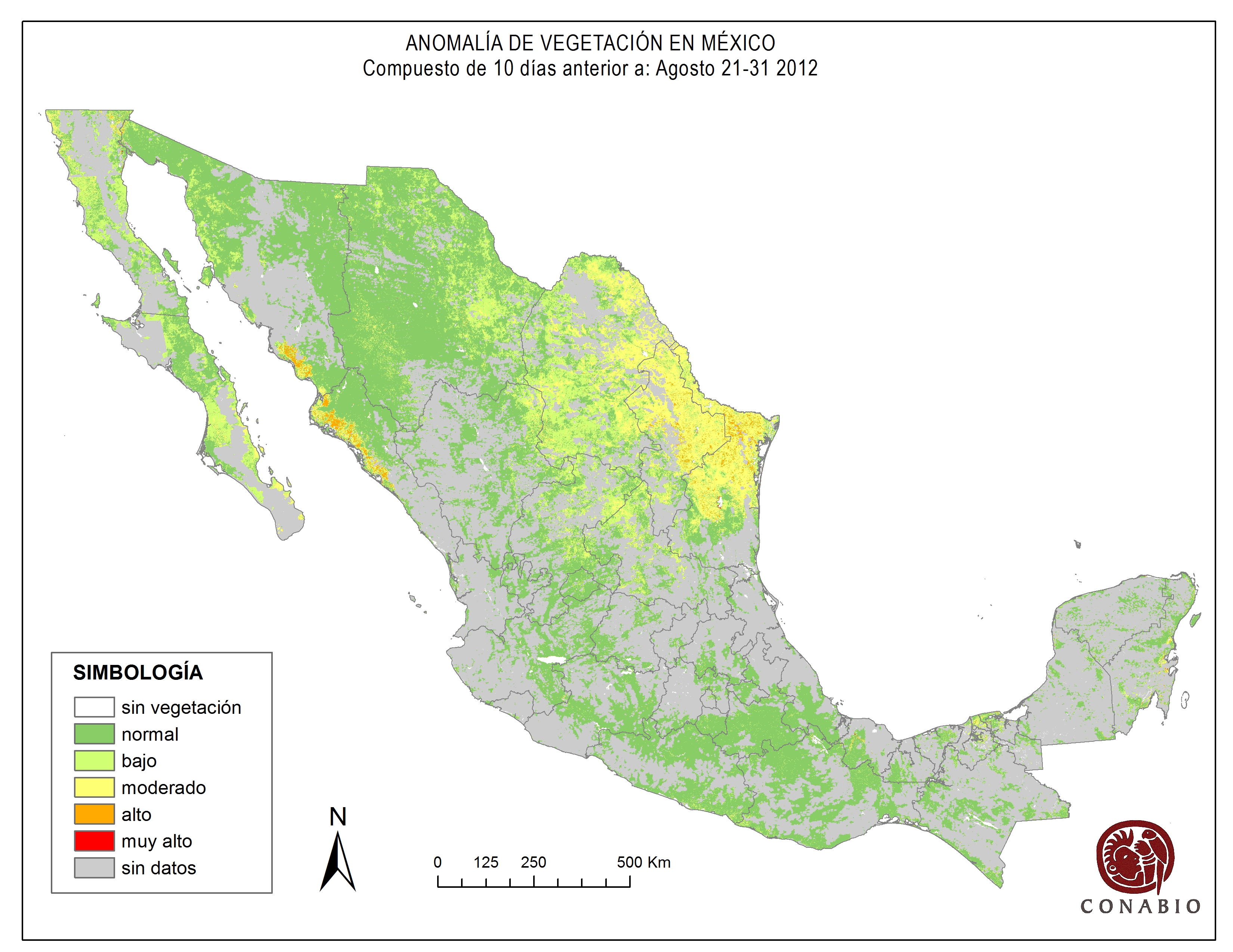 Indica el riesgo de propagación de incendios forestales. Se basa exclusivamente en el vigor de la vegetación, cuanto más seca está la vegetación, más rápido se podrá extender el posible fuego (incendio). Los valores para el índice son: Bajo -> Normal -> Alto -> Muy alto NA (No aplica) se refiere al agua, vegetación no arbolada y los usos de suelo mostrados en gris. ND (No disponible) indica que no hubo información para generar el índice. |