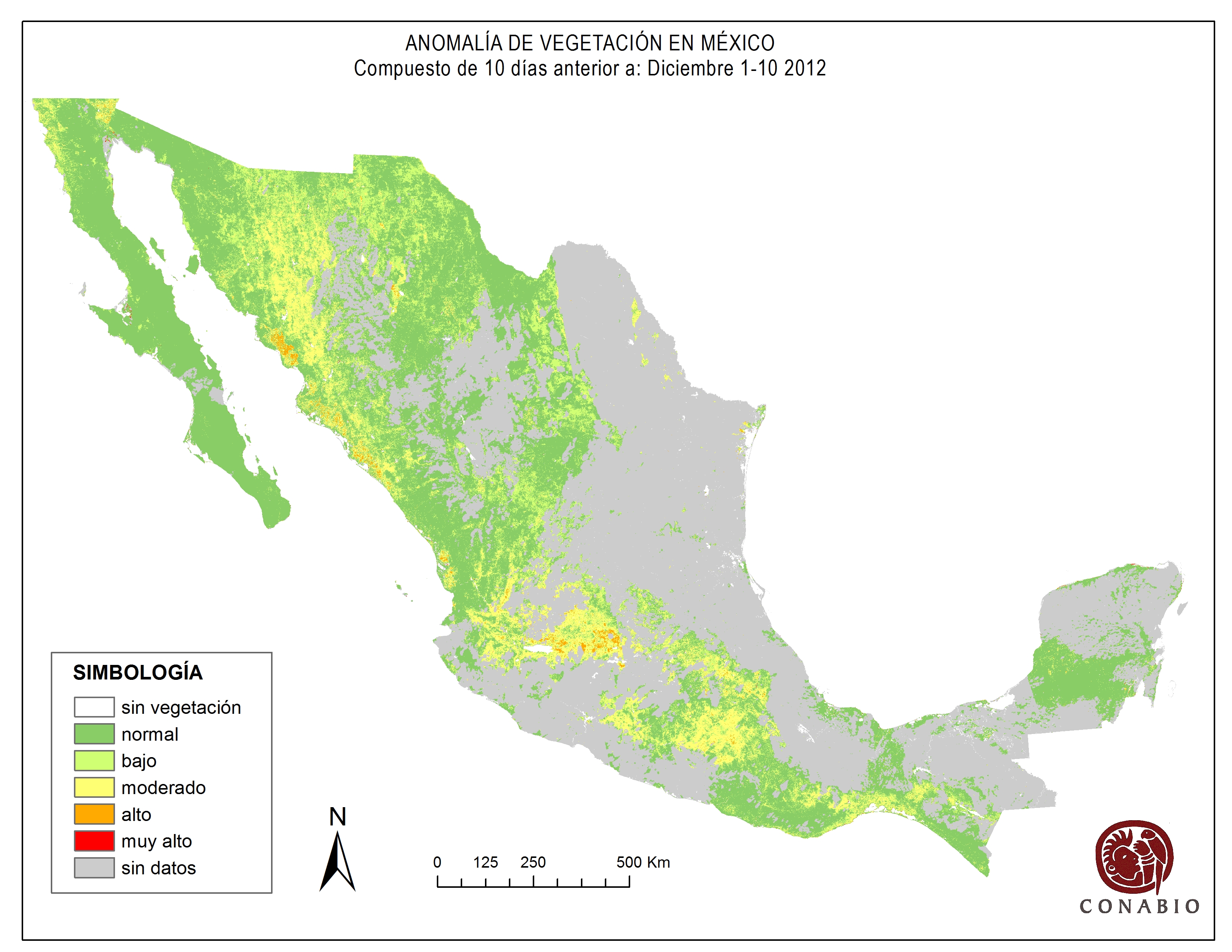 Indica el riesgo de propagación de incendios forestales. Se basa exclusivamente en el vigor de la vegetación, cuanto más seca está la vegetación, más rápido se podrá extender el posible fuego (incendio). Los valores para el índice son: Bajo -> Normal -> Alto -> Muy alto NA (No aplica) se refiere al agua, vegetación no arbolada y los usos de suelo mostrados en gris. ND (No disponible) indica que no hubo información para generar el índice. |