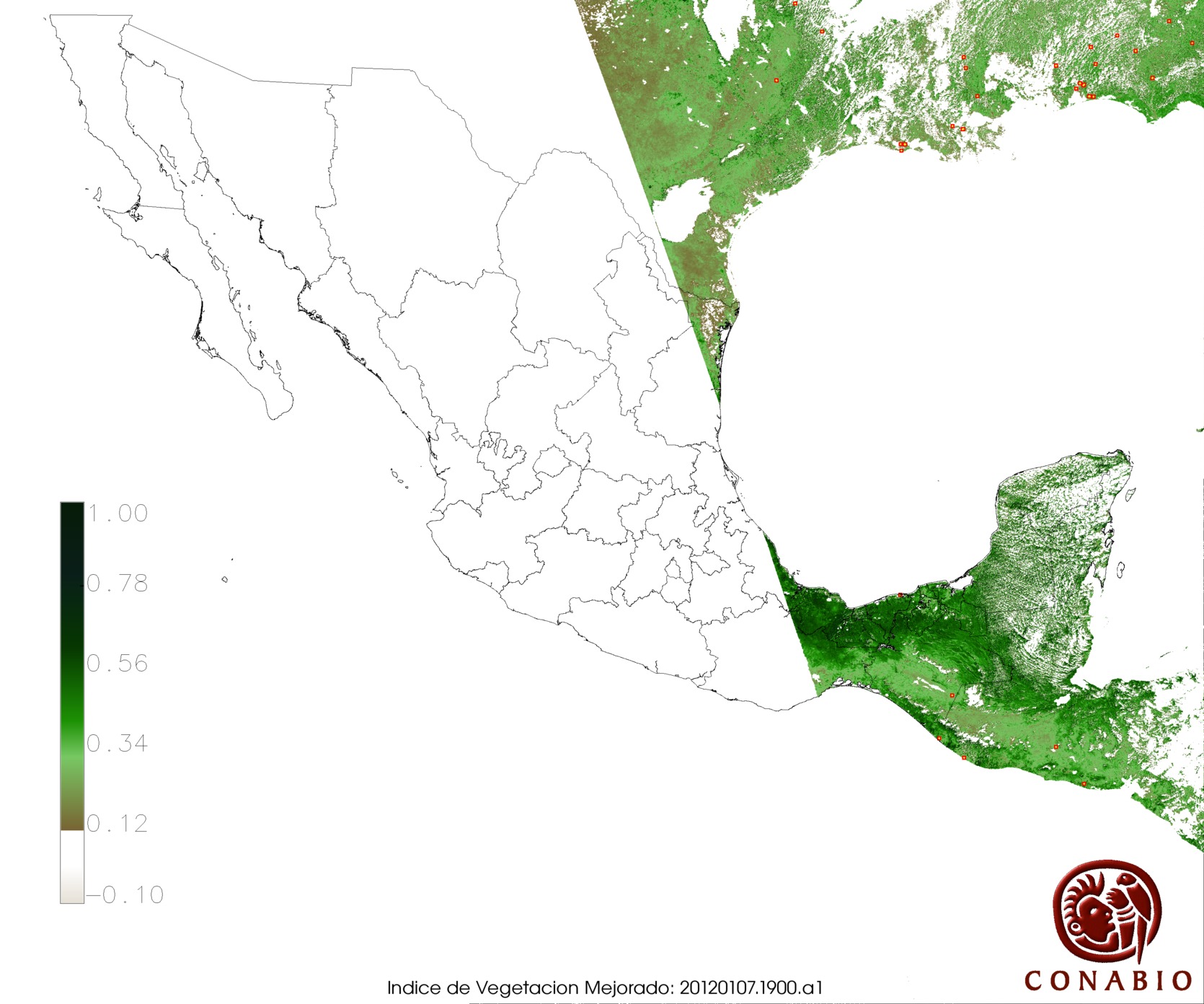 Nubosidad en el terreno:7% Nubosidad sobre México:2% Datos nulos en la escena:0% Datos nulos sobre México:0% |