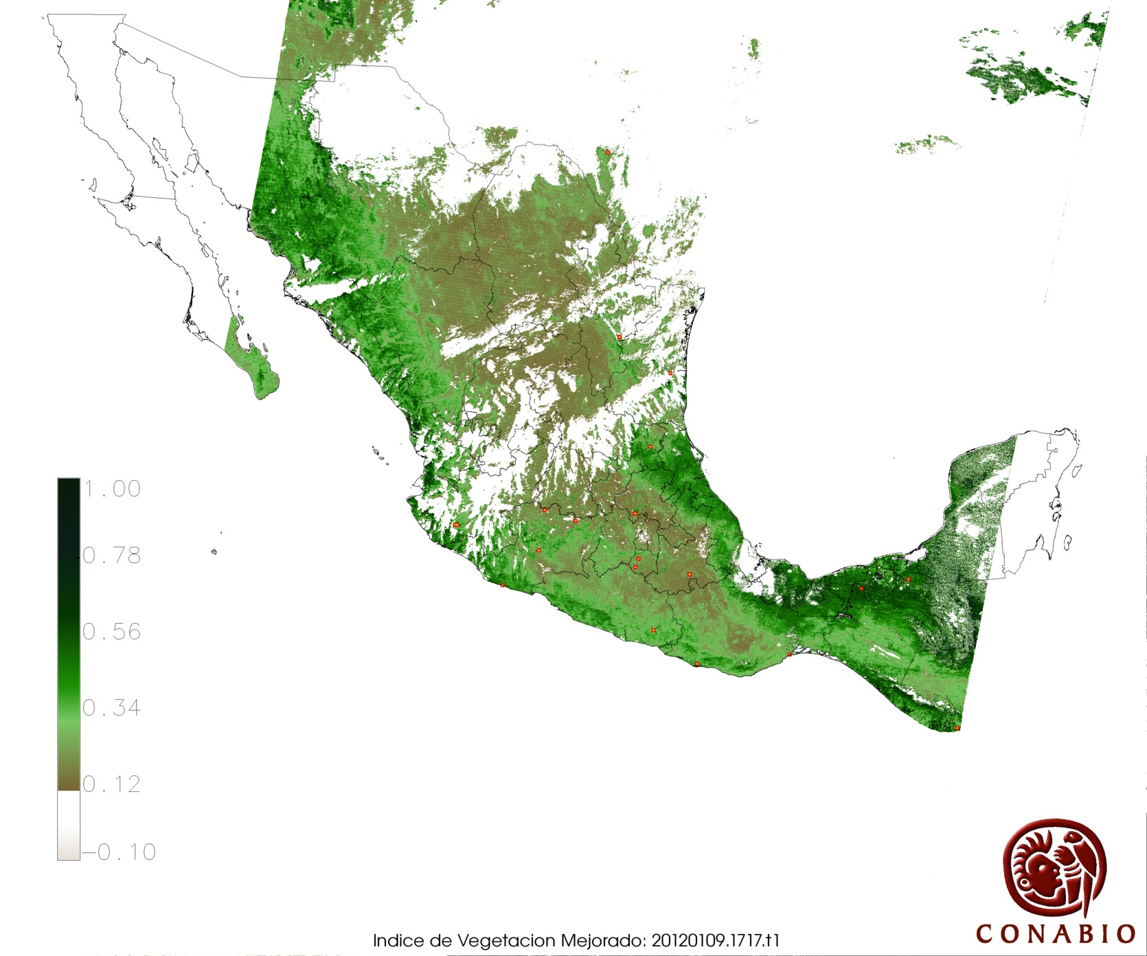 Los valores del índice van de -1 a 1, entre más cercano al valor 1 la vegetación presenta mayor vigor. Los índices de vegetación son utilizados para conocer el comportamiento de la vegetación tanto espacial como temporal. |