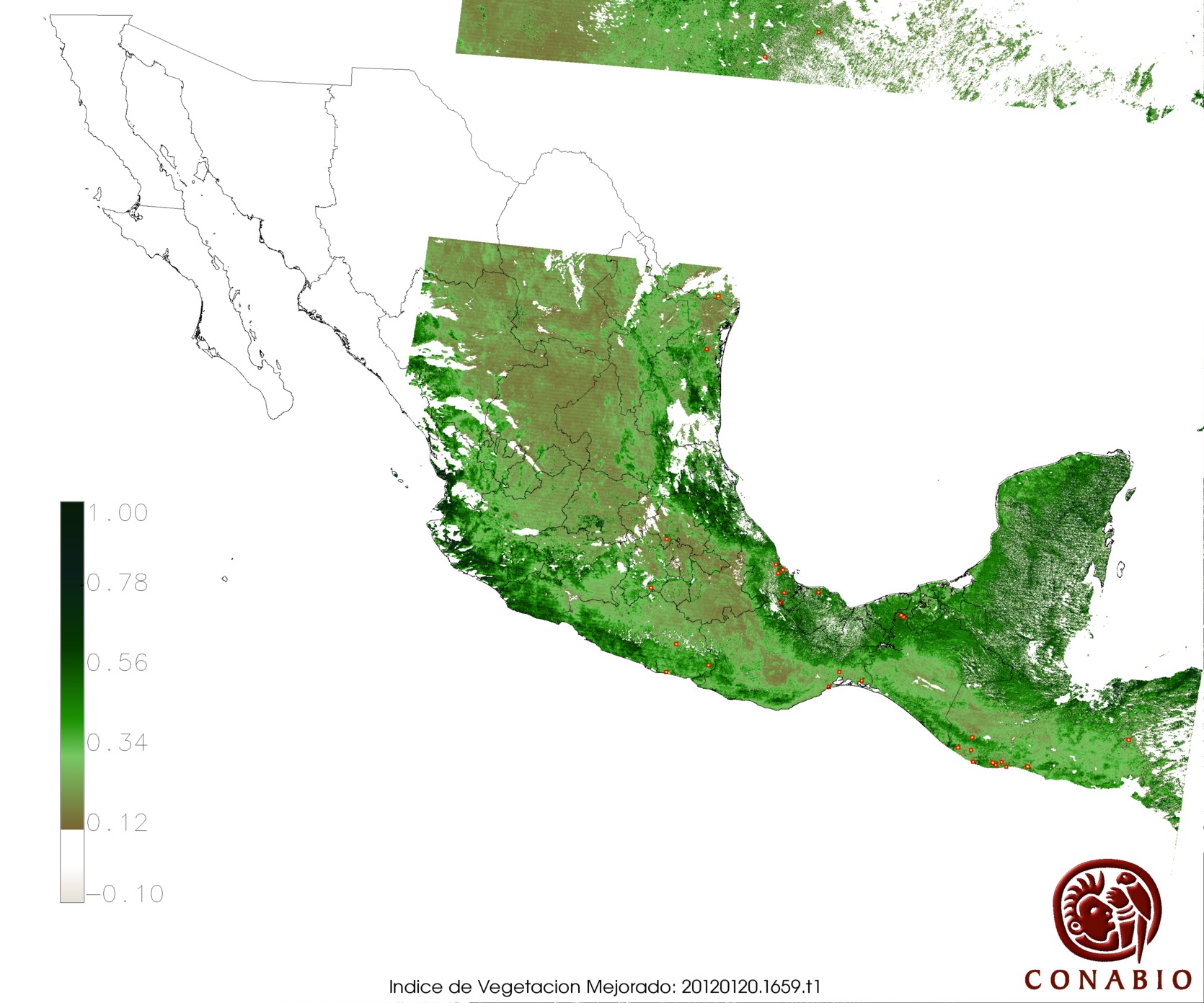 Los valores del índice van de -1 a 1, entre más cercano al valor 1 la vegetación presenta mayor vigor. Los índices de vegetación son utilizados para conocer el comportamiento de la vegetación tanto espacial como temporal. |