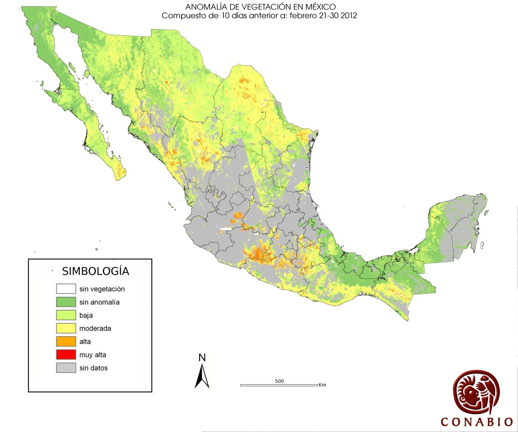 Indica el riesgo de propagación de incendios forestales. Se basa exclusivamente en el vigor de la vegetación, cuanto más seca está la vegetación, más rápido se podrá extender el posible fuego (incendio). Los valores para el índice son: Bajo -> Normal -> Alto -> Muy alto NA (No aplica) se refiere al agua, vegetación no arbolada y los usos de suelo mostrados en gris. ND (No disponible) indica que no hubo información para generar el índice. |