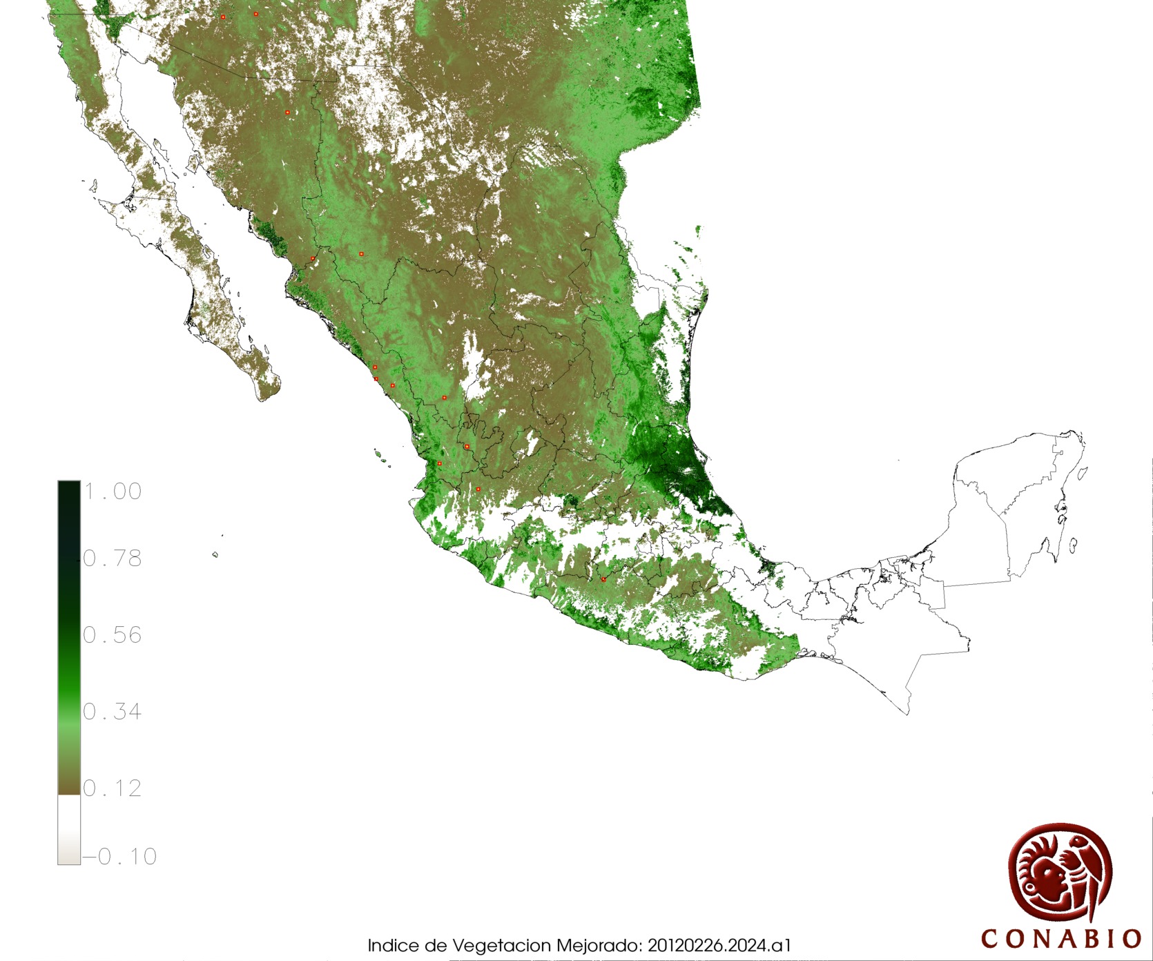 Los valores del índice van de -1 a 1, entre más cercano al valor 1 la vegetación presenta mayor vigor. Los índices de vegetación son utilizados para conocer el comportamiento de la vegetación tanto espacial como temporal. |