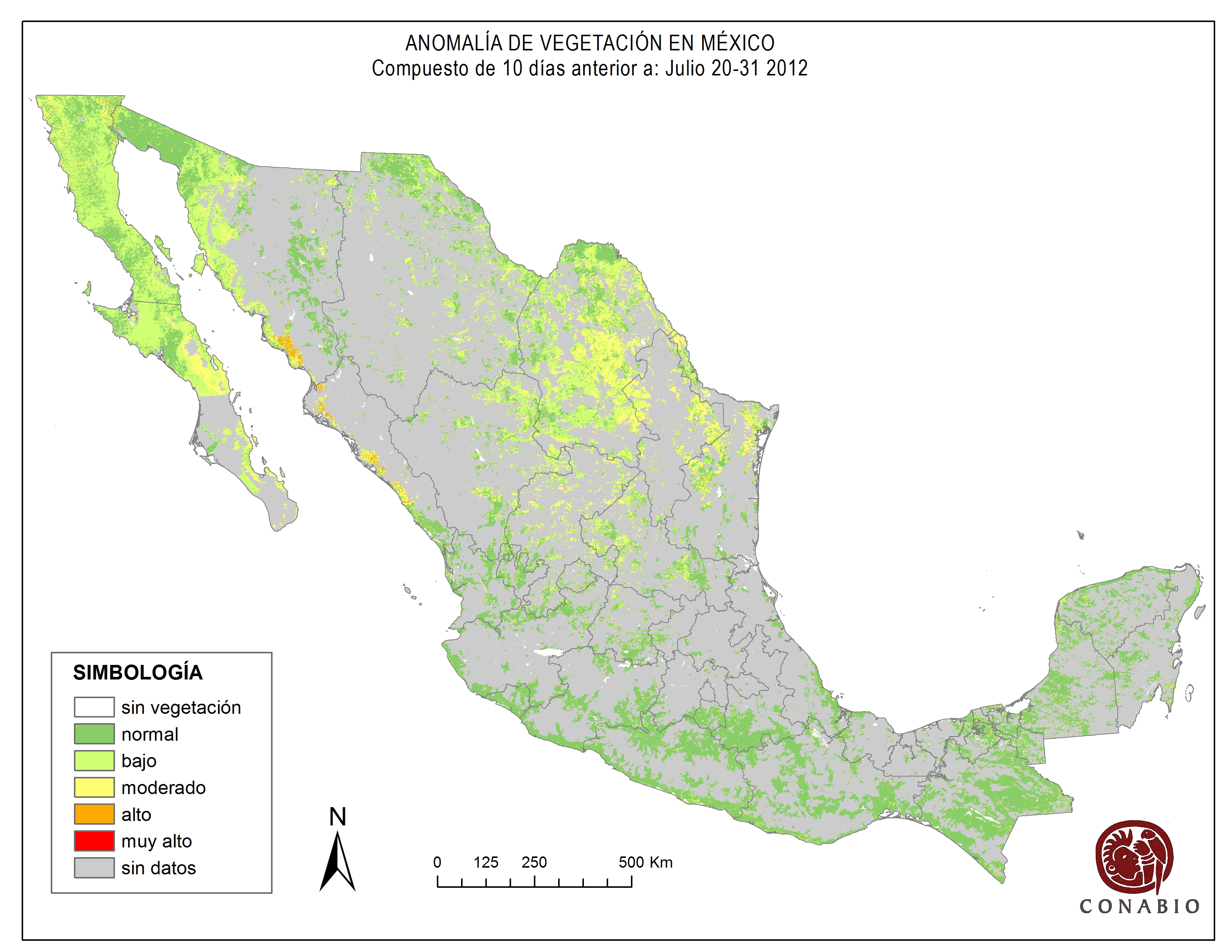 Indica el riesgo de propagación de incendios forestales. Se basa exclusivamente en el vigor de la vegetación, cuanto más seca está la vegetación, más rápido se podrá extender el posible fuego (incendio). Los valores para el índice son: Bajo -> Normal -> Alto -> Muy alto NA (No aplica) se refiere al agua, vegetación no arbolada y los usos de suelo mostrados en gris. ND (No disponible) indica que no hubo información para generar el índice. |