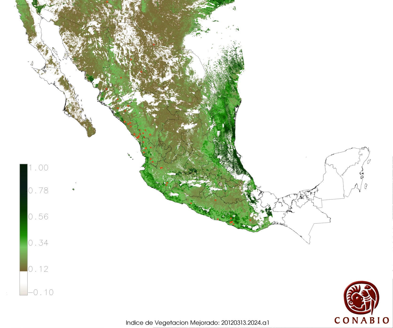 Los valores del índice van de -1 a 1, entre más cercano al valor 1 la vegetación presenta mayor vigor. Los índices de vegetación son utilizados para conocer el comportamiento de la vegetación tanto espacial como temporal. |