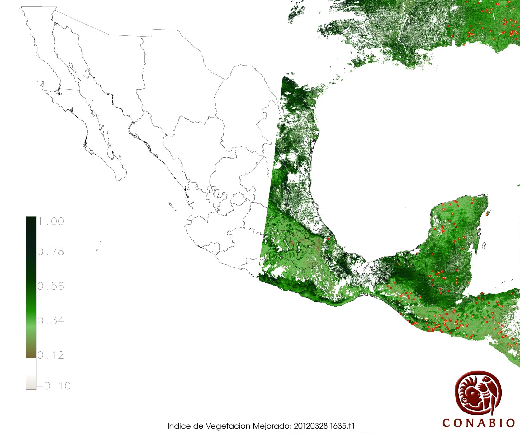Los valores del índice van de -1 a 1, entre más cercano al valor 1 la vegetación presenta mayor vigor. Los índices de vegetación son utilizados para conocer el comportamiento de la vegetación tanto espacial como temporal. |