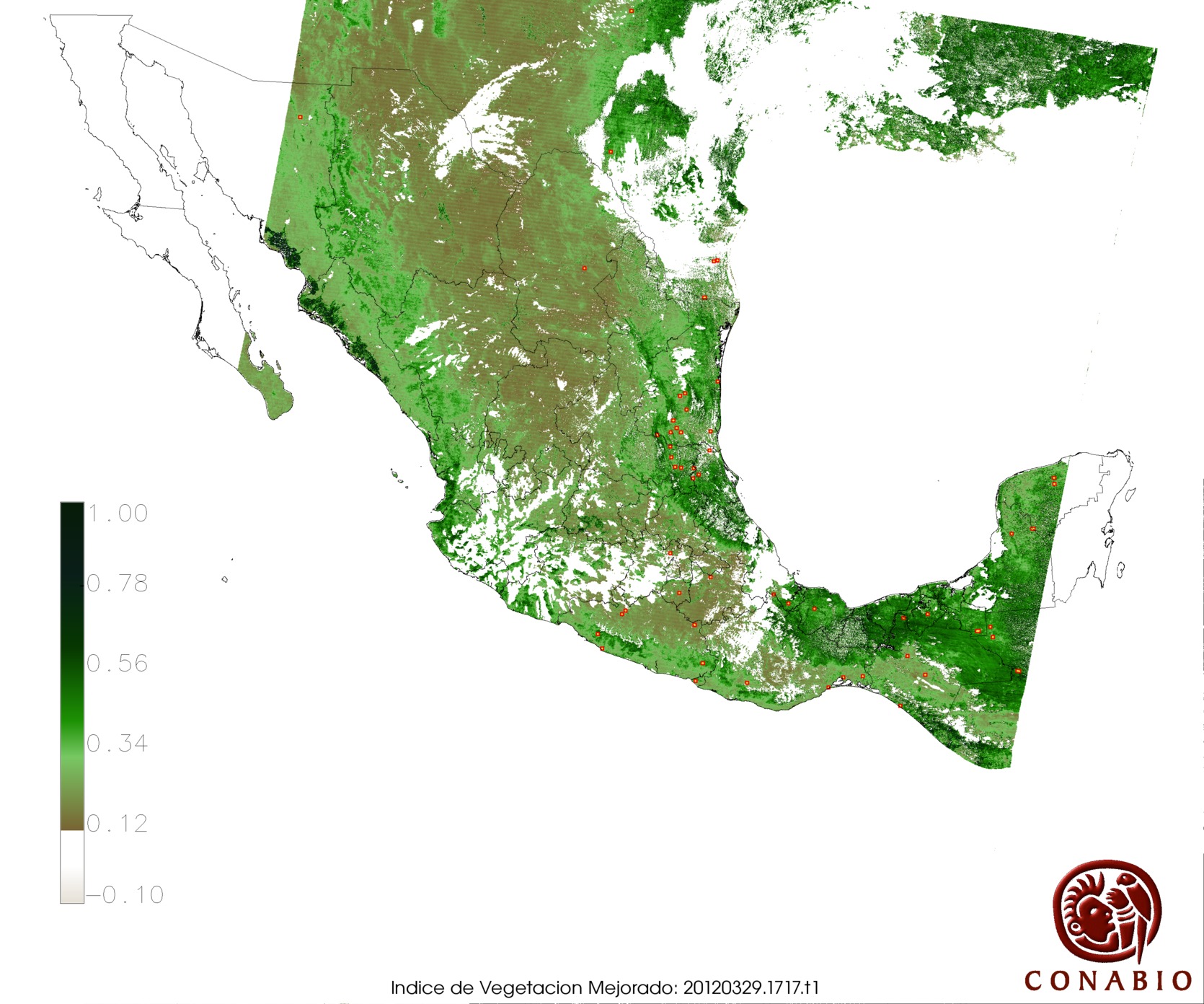 Nubosidad en el terreno:17% Nubosidad sobre México:10% Datos nulos en la escena:0% Datos nulos sobre México:0% |