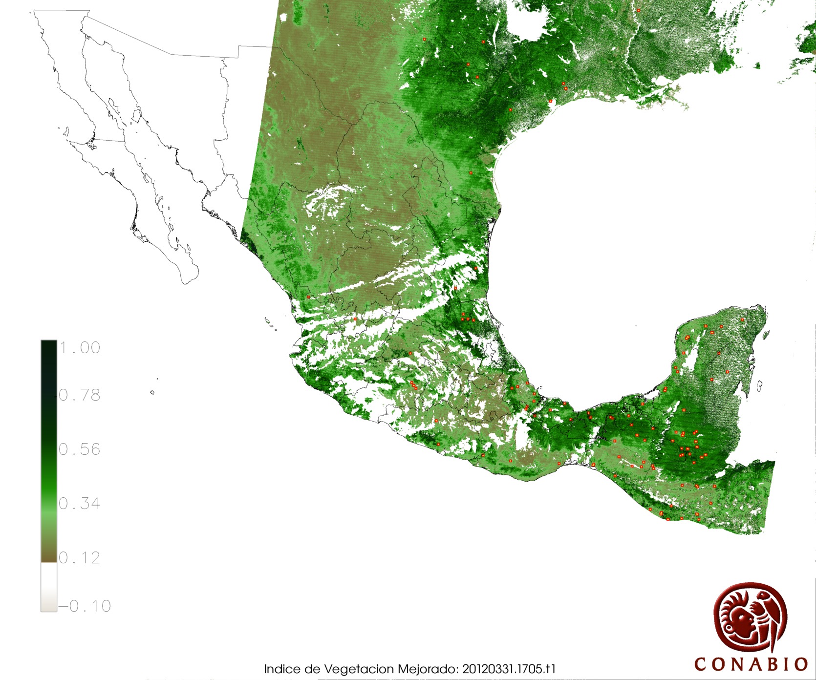 | X= Vegetación con alta susceptibilidad de incendios | Nota: Para obtener puntos de calor sobre un Modelo Digital del Terreno y Vegetación, seleccionar el número en la columna "Indice". Los siguientes usos de suelo se muestran en gris: agricultura, área sin vegetación, cuerpos de agua, pastizal cultivado e inducido. |