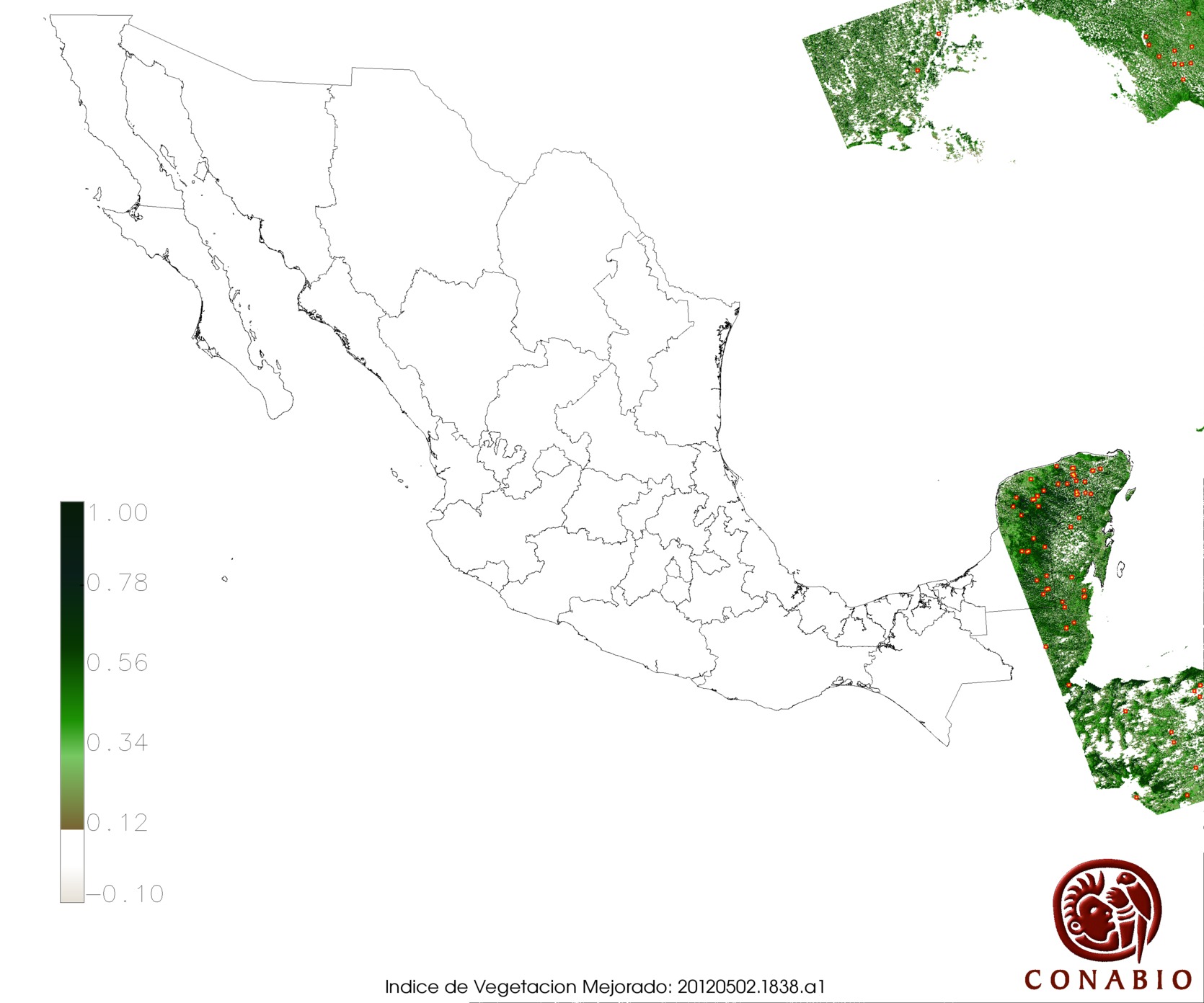 Los valores del índice van de -1 a 1, entre más cercano al valor 1 la vegetación presenta mayor vigor. Los índices de vegetación son utilizados para conocer el comportamiento de la vegetación tanto espacial como temporal. |