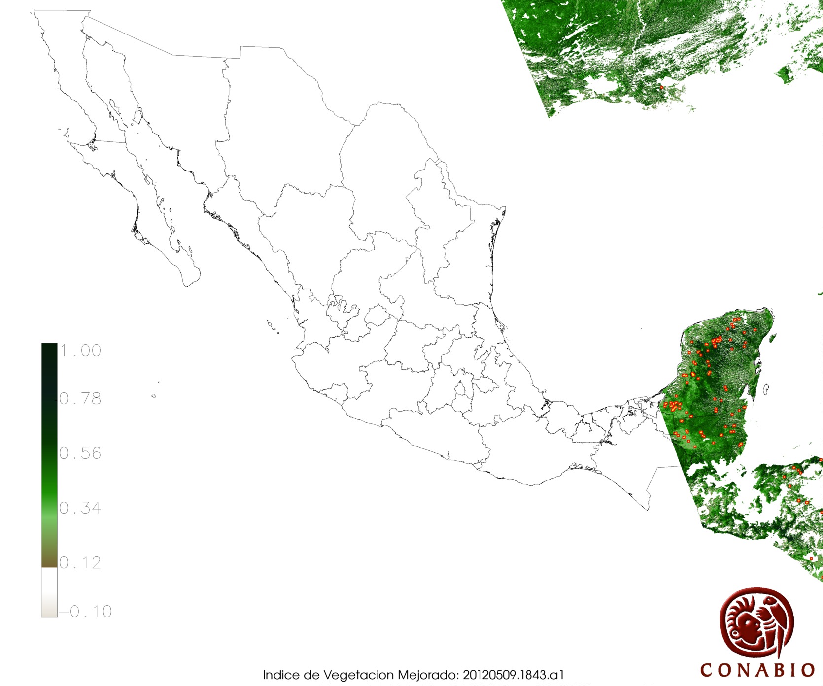 | X= Vegetación con alta susceptibilidad de incendios | Nota: Para obtener puntos de calor sobre un Modelo Digital del Terreno y Vegetación, seleccionar el número en la columna "Indice". Los siguientes usos de suelo se muestran en gris: agricultura, área sin vegetación, cuerpos de agua, pastizal cultivado e inducido. |