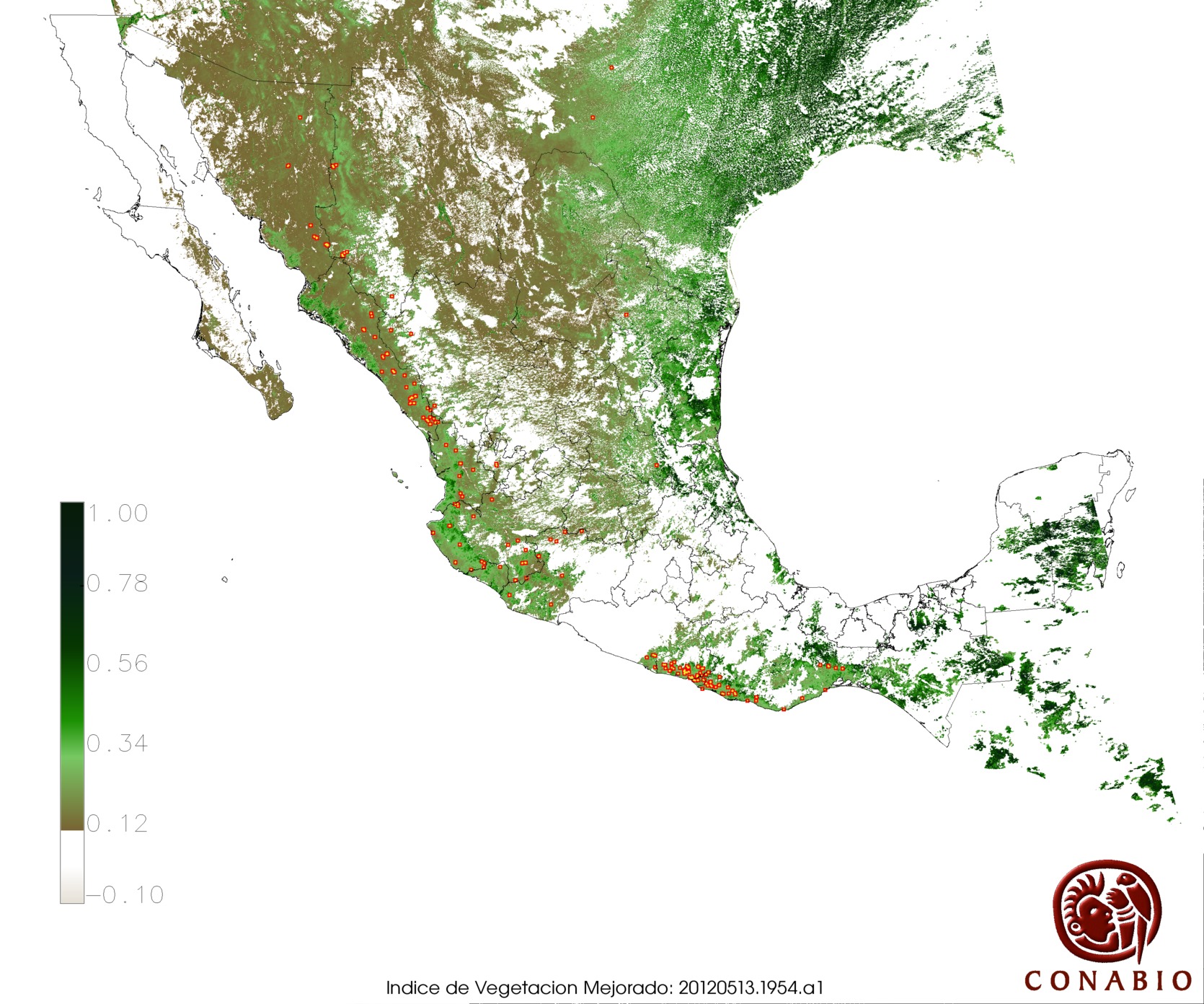Indica el riesgo de propagación de incendios forestales. Se basa exclusivamente en el vigor de la vegetación, cuanto más seca está la vegetación, más rápido se podrá extender el posible fuego (incendio). Los valores para el índice son: Bajo -> Normal -> Alto -> Muy alto NA (No aplica) se refiere al agua, vegetación no arbolada y los usos de suelo mostrados en gris. ND (No disponible) indica que no hubo información para generar el índice. |