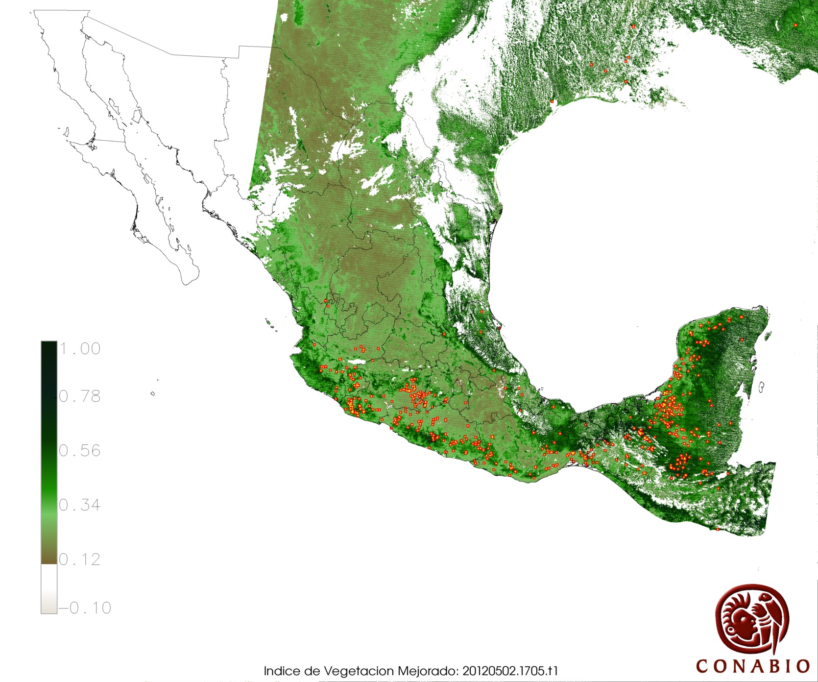 | X= Vegetación con alta susceptibilidad de incendios | Nota: Para obtener puntos de calor sobre un Modelo Digital del Terreno y Vegetación, seleccionar el número en la columna "Indice". Los siguientes usos de suelo se muestran en gris: agricultura, área sin vegetación, cuerpos de agua, pastizal cultivado e inducido. |