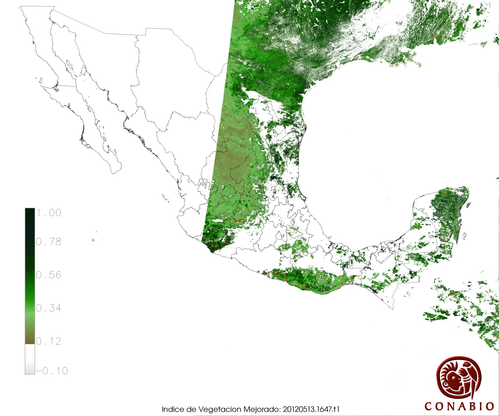 Los valores del índice van de -1 a 1, entre más cercano al valor 1 la vegetación presenta mayor vigor. Los índices de vegetación son utilizados para conocer el comportamiento de la vegetación tanto espacial como temporal. |