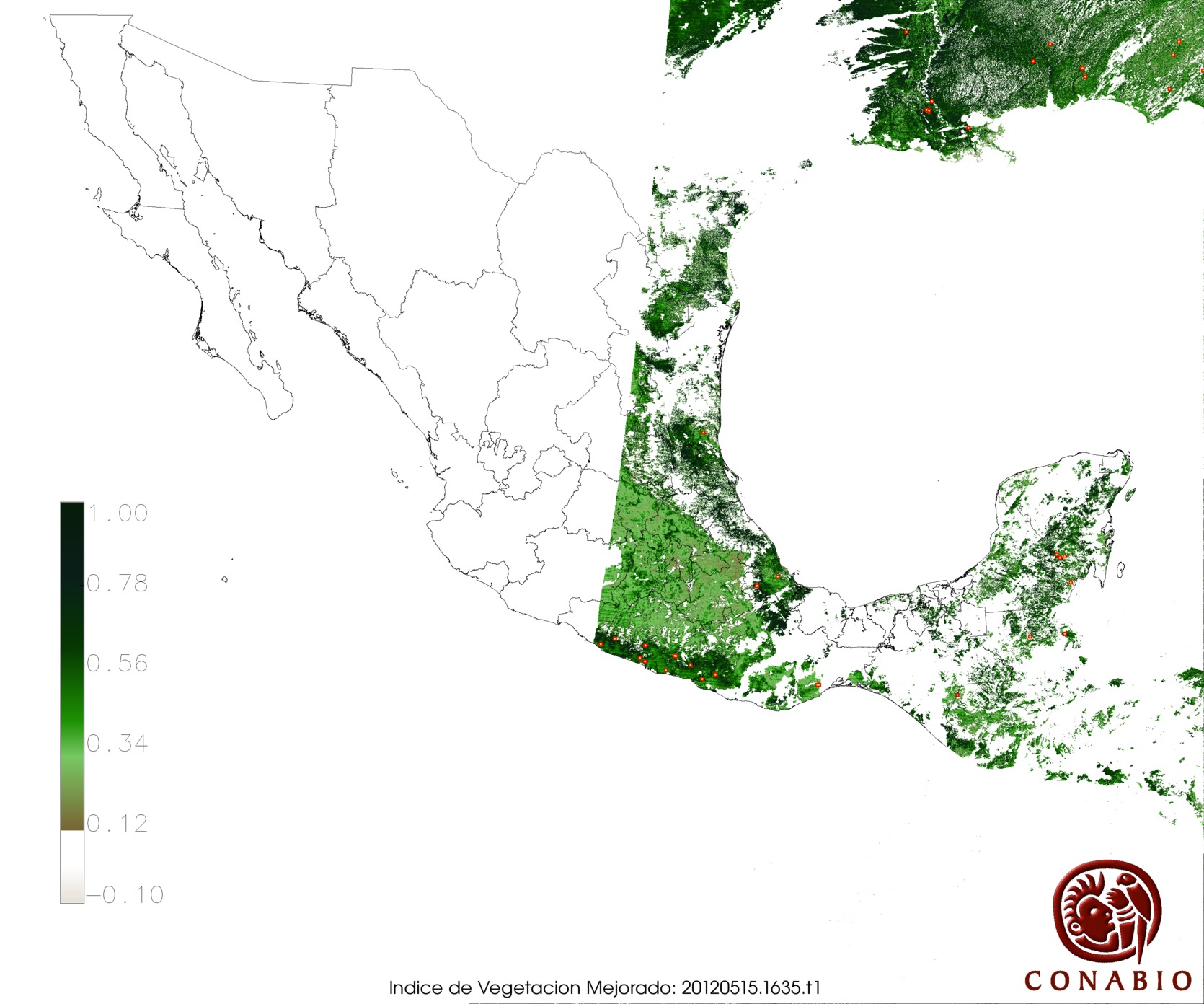 Los valores del índice van de -1 a 1, entre más cercano al valor 1 la vegetación presenta mayor vigor. Los índices de vegetación son utilizados para conocer el comportamiento de la vegetación tanto espacial como temporal. |