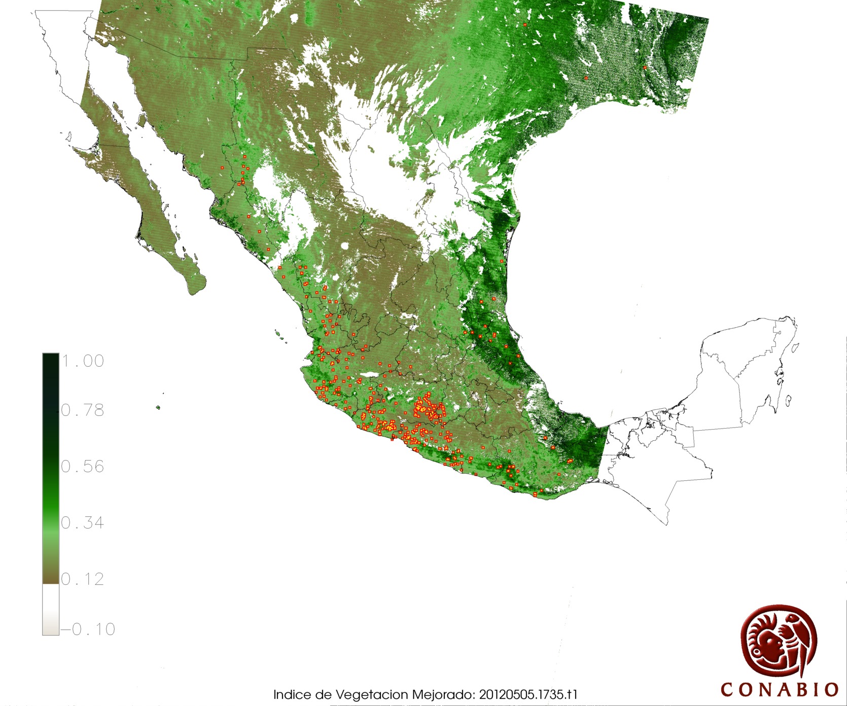 | X= Vegetación con alta susceptibilidad de incendios | Nota: Para obtener puntos de calor sobre un Modelo Digital del Terreno y Vegetación, seleccionar el número en la columna "Indice". Los siguientes usos de suelo se muestran en gris: agricultura, área sin vegetación, cuerpos de agua, pastizal cultivado e inducido. |
