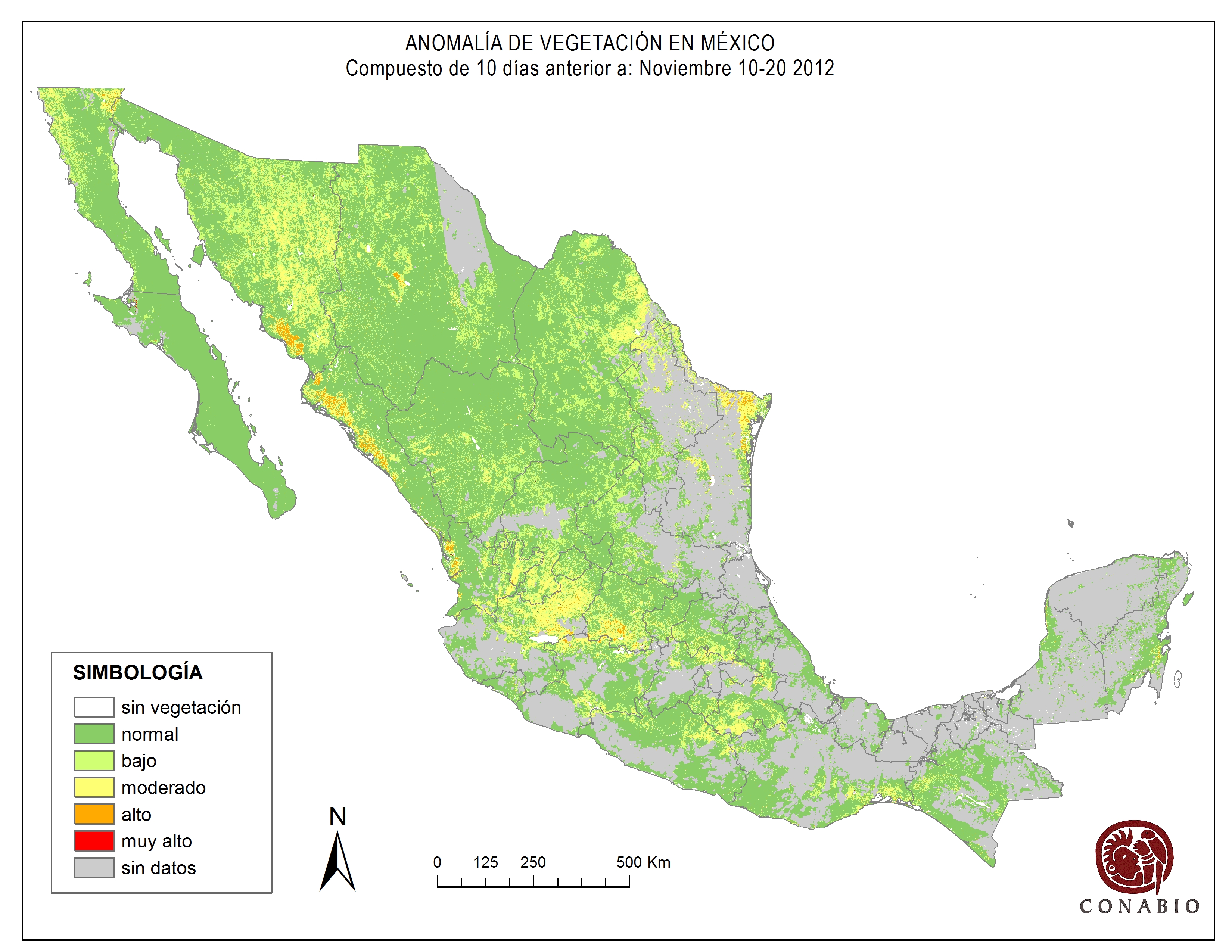 Indica el riesgo de propagación de incendios forestales. Se basa exclusivamente en el vigor de la vegetación, cuanto más seca está la vegetación, más rápido se podrá extender el posible fuego (incendio). Los valores para el índice son: Bajo -> Normal -> Alto -> Muy alto NA (No aplica) se refiere al agua, vegetación no arbolada y los usos de suelo mostrados en gris. ND (No disponible) indica que no hubo información para generar el índice. |