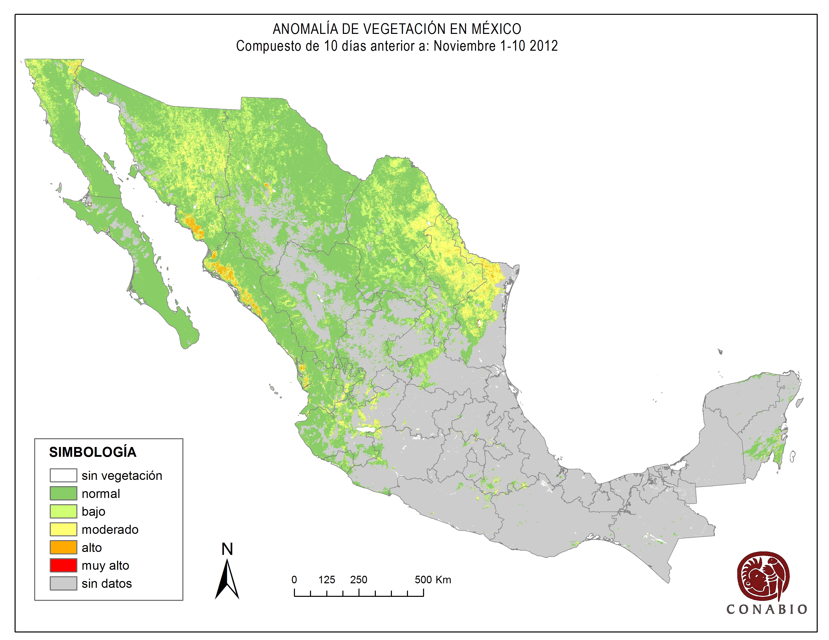 Indica el riesgo de propagación de incendios forestales. Se basa exclusivamente en el vigor de la vegetación, cuanto más seca está la vegetación, más rápido se podrá extender el posible fuego (incendio). Los valores para el índice son: Bajo -> Normal -> Alto -> Muy alto NA (No aplica) se refiere al agua, vegetación no arbolada y los usos de suelo mostrados en gris. ND (No disponible) indica que no hubo información para generar el índice. |