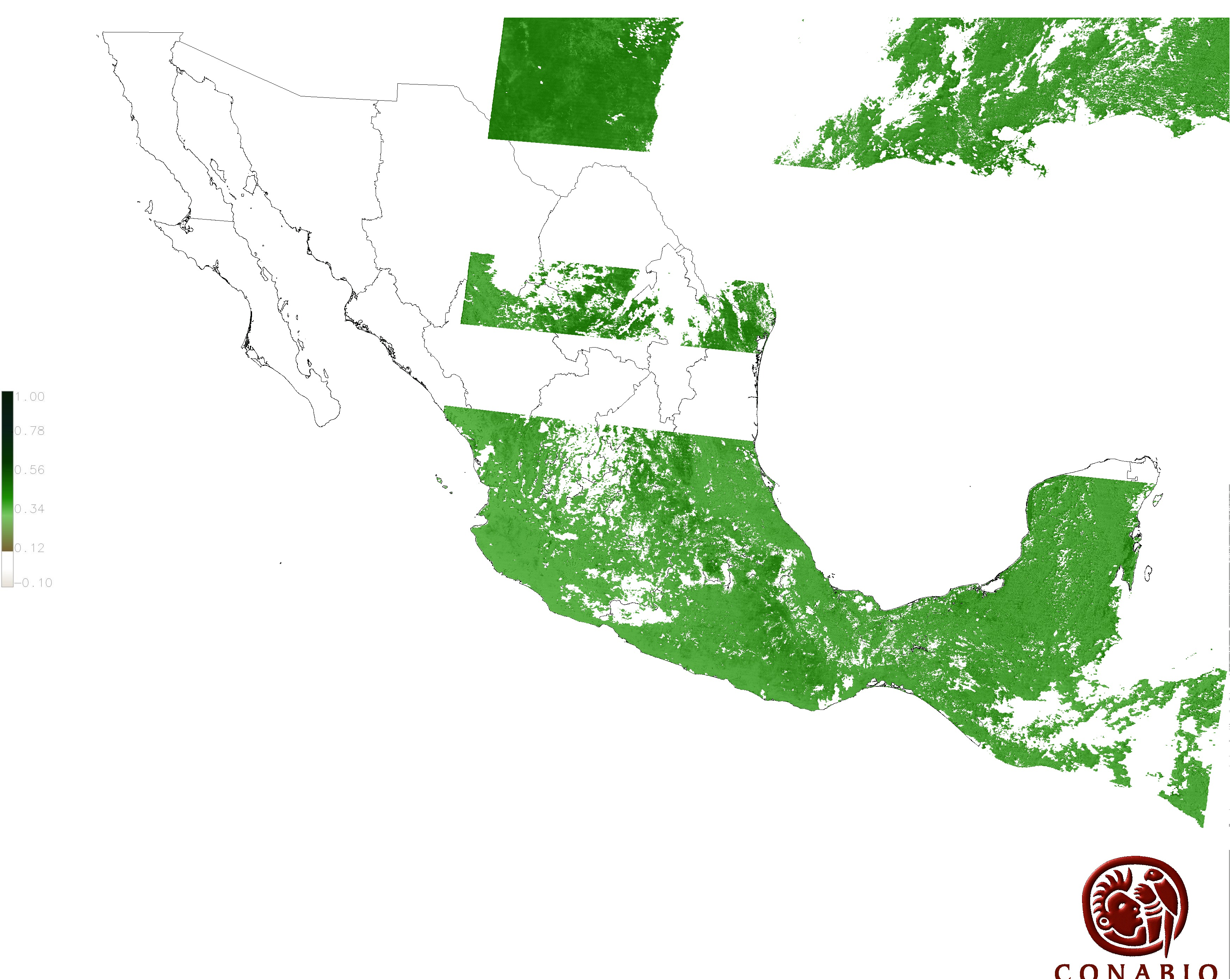 Los valores del índice van de -1 a 1, entre más cercano al valor 1 la vegetación presenta mayor vigor. Los índices de vegetación son utilizados para conocer el comportamiento de la vegetación tanto espacial como temporal. |