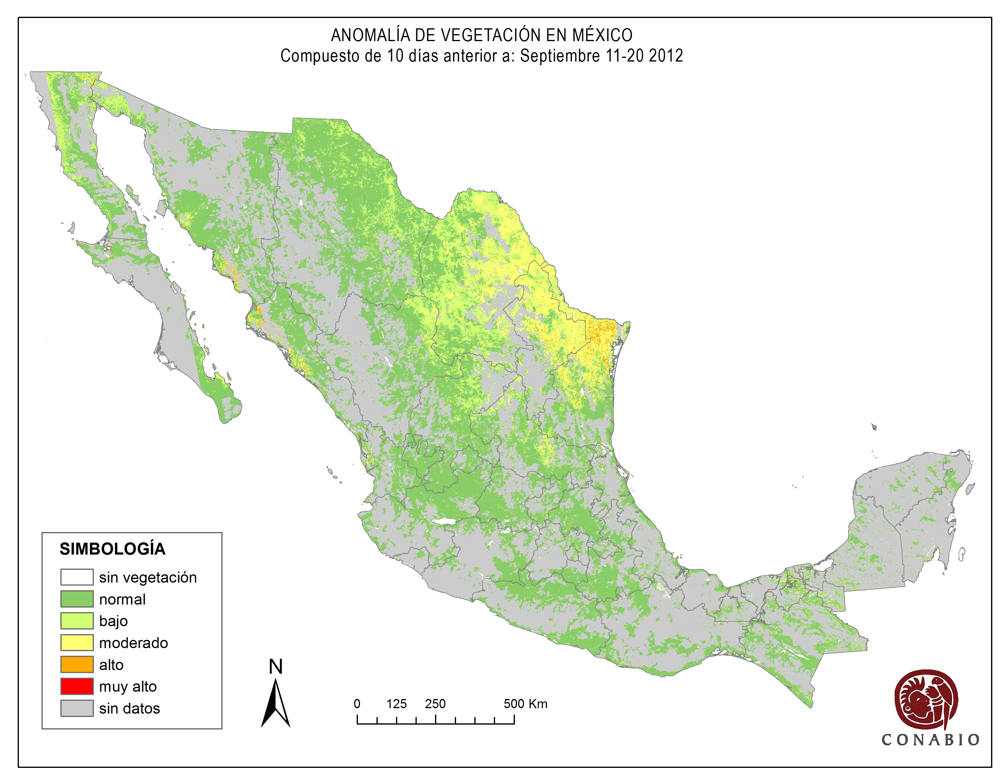 Indica el riesgo de propagación de incendios forestales. Se basa exclusivamente en el vigor de la vegetación, cuanto más seca está la vegetación, más rápido se podrá extender el posible fuego (incendio). Los valores para el índice son: Bajo -> Normal -> Alto -> Muy alto NA (No aplica) se refiere al agua, vegetación no arbolada y los usos de suelo mostrados en gris. ND (No disponible) indica que no hubo información para generar el índice. |