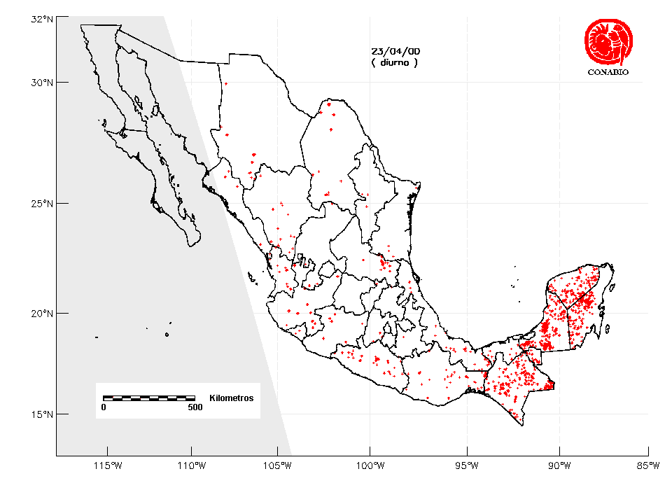 Se considera como punto de calor al elemento espacial mínimo de la imagen (pixel) que reporta una temperatura elevada. Para las imágenes diurnas la temperatura mínima considera es de 42°C y para las imágenes nocturnas es de 25°C. |