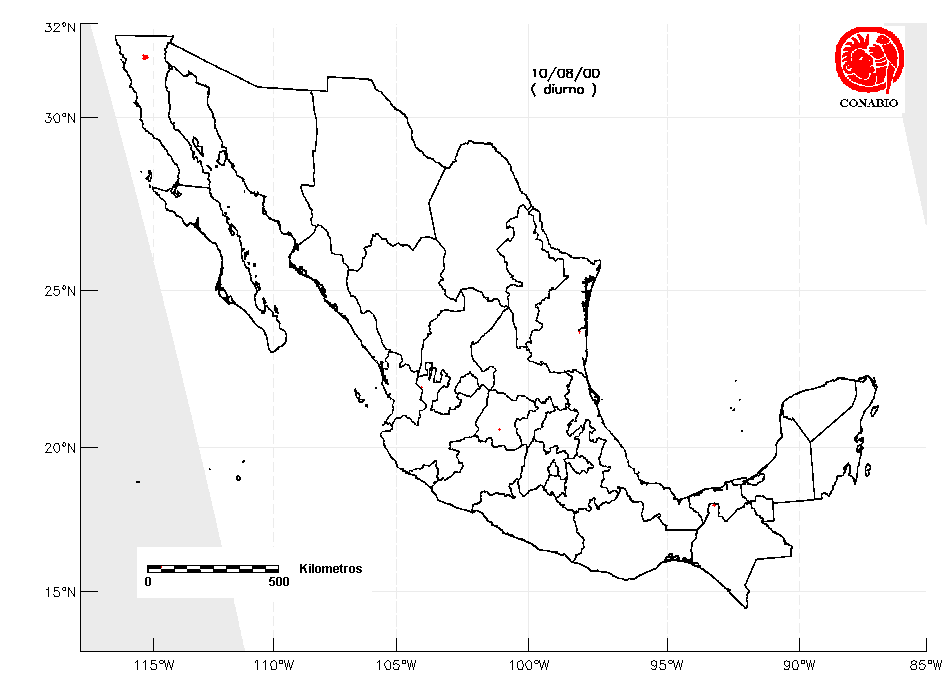 Se considera como punto de calor al elemento espacial mínimo de la imagen (pixel) que reporta una temperatura elevada. Para las imágenes diurnas la temperatura mínima considera es de 42°C y para las imágenes nocturnas es de 25°C. |