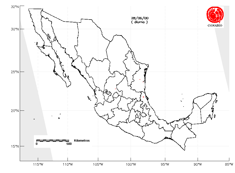 Se considera como punto de calor al elemento espacial mínimo de la imagen (pixel) que reporta una temperatura elevada. Para las imágenes diurnas la temperatura mínima considera es de 42°C y para las imágenes nocturnas es de 25°C. |