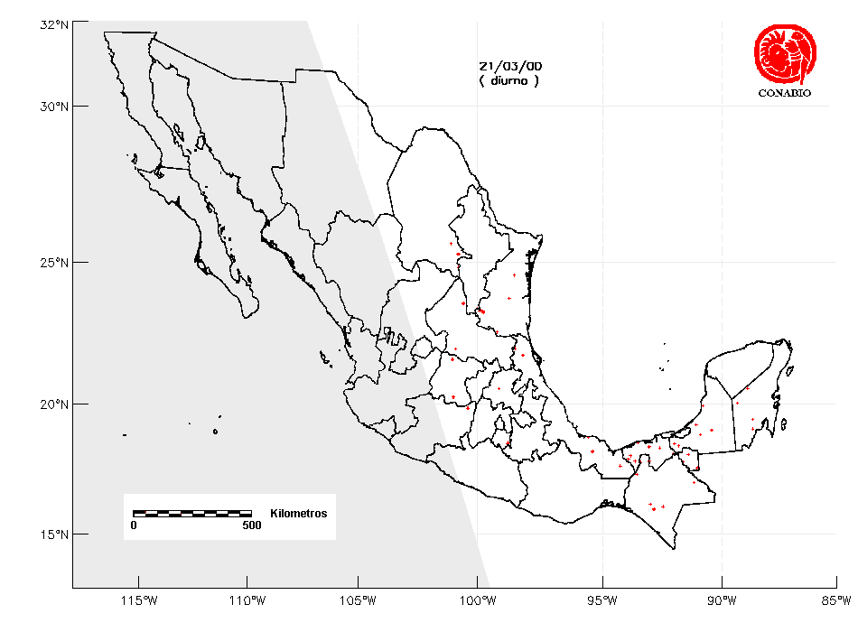 Se considera como punto de calor al elemento espacial mínimo de la imagen (pixel) que reporta una temperatura elevada. Para las imágenes diurnas la temperatura mínima considera es de 42°C y para las imágenes nocturnas es de 25°C. |