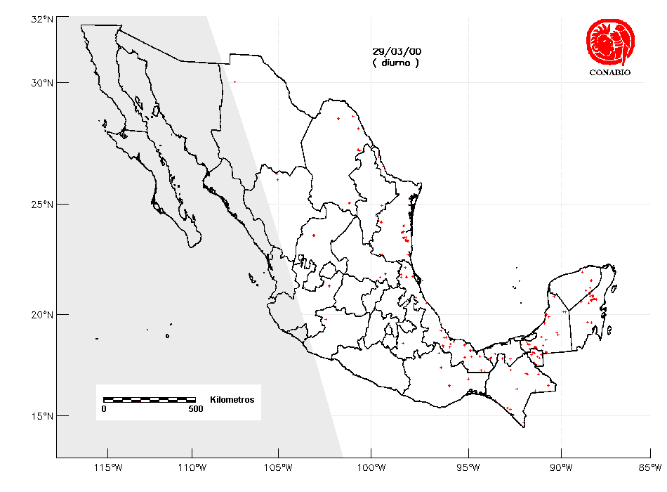 Se considera como punto de calor al elemento espacial mínimo de la imagen (pixel) que reporta una temperatura elevada. Para las imágenes diurnas la temperatura mínima considera es de 42°C y para las imágenes nocturnas es de 25°C. |