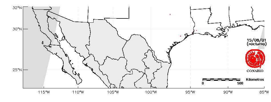 Se considera como punto de calor al elemento espacial mínimo de la imagen (pixel) que reporta una temperatura elevada. Para las imágenes diurnas la temperatura mínima considera es de 42°C y para las imágenes nocturnas es de 25°C. |