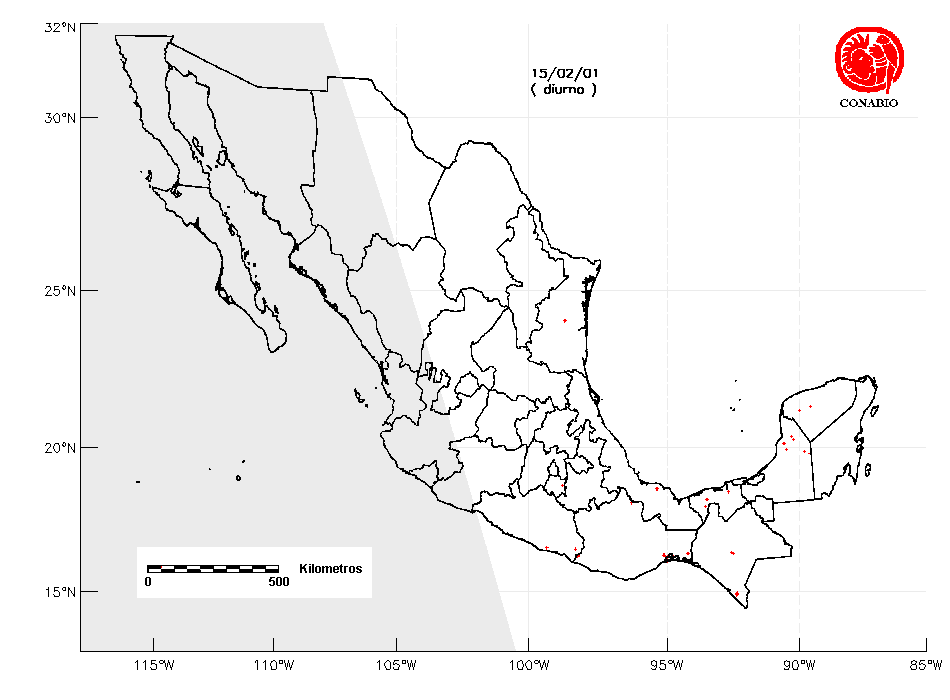 | 27 | -92 30 36 | 15 1 50 | Pastizal Cultivado | "HUEHUETAN","CHIAPAS" | CERCA DE UNA AREA NATURAL PROTEGIDA | 15.6 | ||