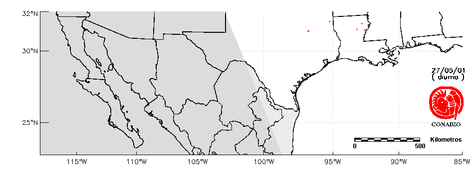 Se considera como punto de calor al elemento espacial mínimo de la imagen (pixel) que reporta una temperatura elevada. Para las imágenes diurnas la temperatura mínima considera es de 42°C y para las imágenes nocturnas es de 25°C. |